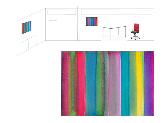 Auf ganz geniale Weise spielt mit diesem Heiss und Kalt, mit Farb-Verbindungen, -Überschneidungen und -Überlagerungen der Künstler Harald Huss. Hier ein Entwurf für die Bürogestaltung einer Auftraggeberin. Die Gemälde stammen aus der Serie „Céret“, in der Huss Lichtstimmungen aus diesem kleinen südfranzösischen Ort verarbeitet.
