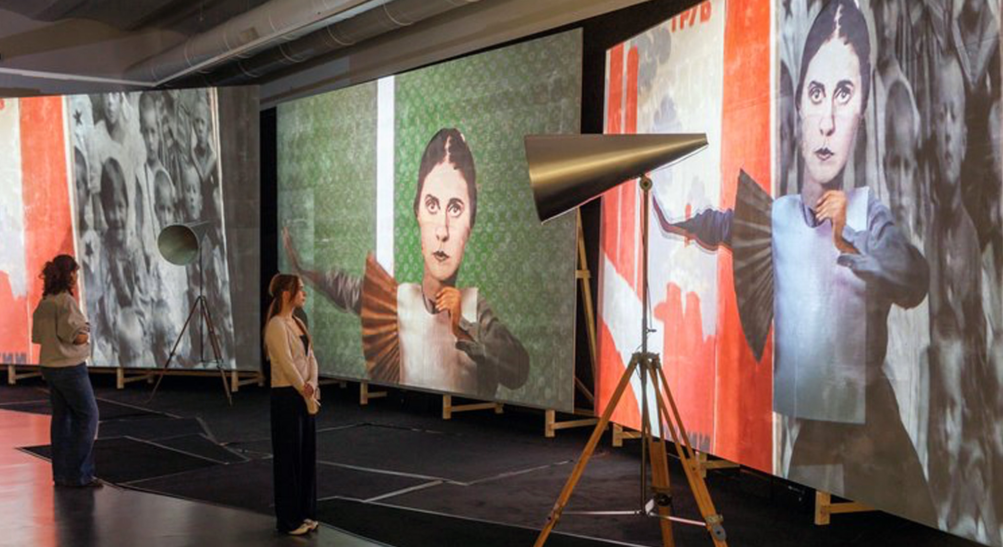 8-Kanal-Filminstallation, vier Megafone mit Lautsprechern, 15 min (in dieser Ausstellung als 7-Kanal-Version präsentiert)